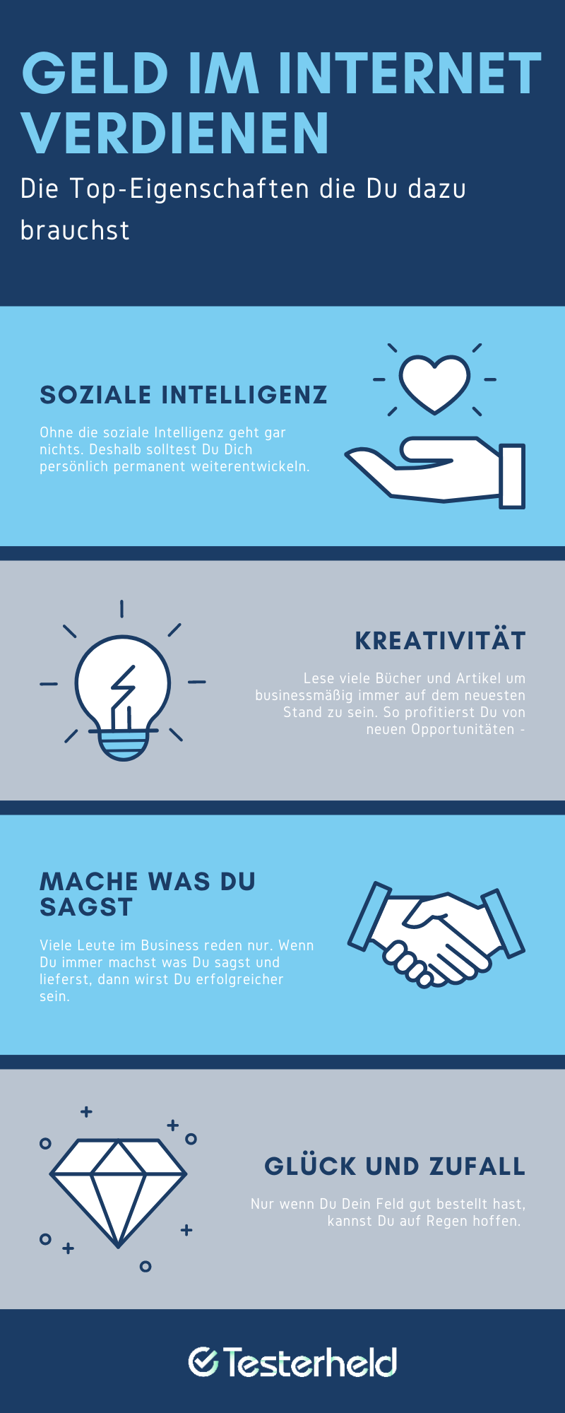 Was braucht es, um erfolgreich im Internet Geld zu verdienen? In unserer Infografik von Testerheld.de erfährst Du, auf was es dabei ankommt.