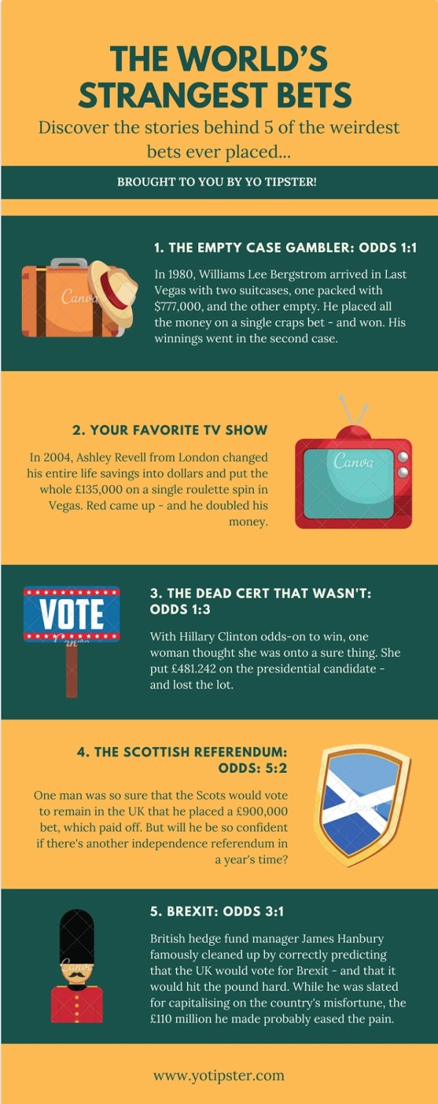 At Yo Tipster! we take our betting guides seriously, so much so that we wouldn’t glance for a second at the ridiculous markets in the infographic above. All tips and predictions on this site are focused on helping hardcore boxing and UFC fans cut through the confusion and make for the best possible bets available. https://yotipster.com/worlds-strangest-bets-infographic/0 Comments
